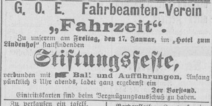 Der Eisenbahnerverein „Kranzspende", der den Zweck verfolgt, die Mitglieder sowie deren Angehörigen bei Todesfällen finanziell zu unterstützen, hält laut heutiger Anzeige seinen diesjährigen Ball, verbunden mit Aufführungen, in den Räumen des Hotels zum Lindenhof am Freitag , den 10. d.M. ab. Der Verein hat sich durch seine früheren Feste einen guten Ruf erworben. (81)