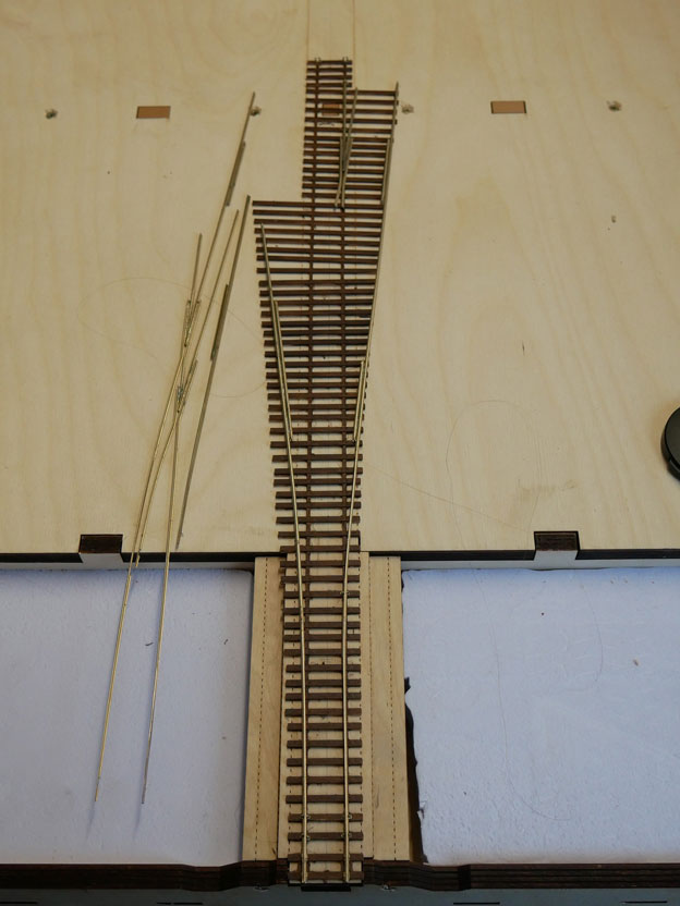 Am 13.10.2024 habe ich dann die Weiche soweit ausgerichtet und die äußeren Schienen bzw. das hintere Herzstück aufgenagelt.